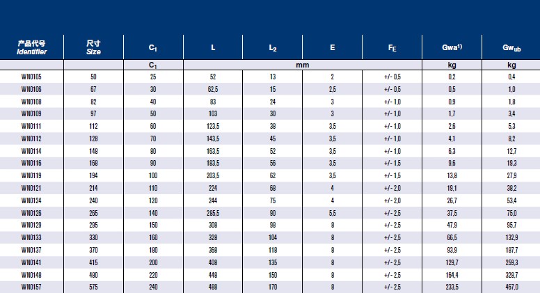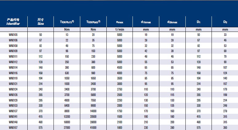该尺寸表比较简单明了,详细的说明了每个规格型号的联轴器的外形尺寸大小,并给出了相应型号的联轴器的扭矩和转速承受力。其中需要注意的是d1kmax和d2kmax这两列,这两列给出的技术参数是联轴器的两端孔径尺寸所能做到的最大尺寸。有些客户对该参数进行误解,以为联轴器的孔径是固定的,该处给出的孔径只是最大值,从0到该值范围内的孔径都是可以做的。由于孔径是定做的,所以订货的时候需要客户提供联轴器的两端孔径便于给您提供成品。有的客户有条件的话也可以自己加工孔径,这样的话我们给您提供的联轴器可以是毛坯 件,也就是不加工孔径的工艺孔联轴器。这样您自己购买回去自己加工一下就可以使用。毛坯件由于不是成品,相当于半成品,在货期上也是会短一些的。一些着急的客户完全可以选择直接购买毛坯件。